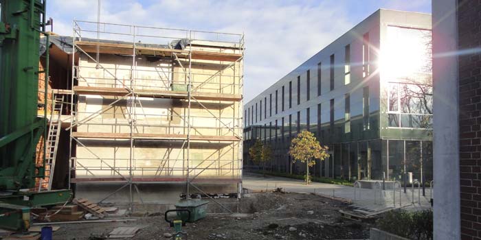Im Zuge der Weiterentwicklung des Gesamtareals der HWK Schwaben an der Siebentischstraße werden Umplanungsmaßnahmen für die Entwicklung eines Berufsbildungs- und Technologiezentrums (BTZ) notwendig. Eine Fortschreibung und Weiterentwicklung der ursprünglich gewählten Materialität und Formensprache bei gleichzeitig geänderen Rahmenbedingungen wurde angestrebt und ist trotz geringerem Budget erreichbar. |