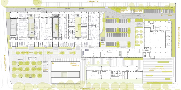 Trotz der vielfältigen und flächenintensiven Erschließungs- und Parkierungsanforderungen wurde in der Planung großer Wert auf eine attraktive Durchgrünung sowie Nutzbarkeit und Atmosphäre der gebäudenahen Freiflächen gelegt. Aufgrund der abschnittsweisen Realisierung über mehrere Jahre waren die Maßstäblichkeit(en) der Freiräume sowie verschiedene funktionstüchtige Zwischenstadien (Provisorien) von besonderm Interesse. |