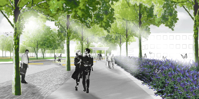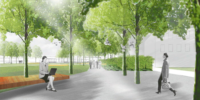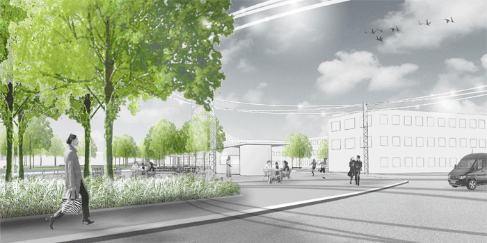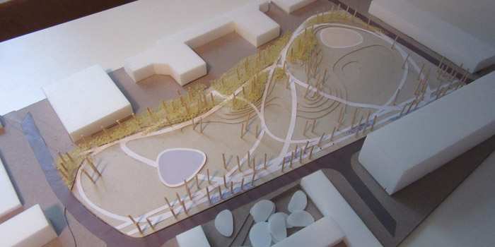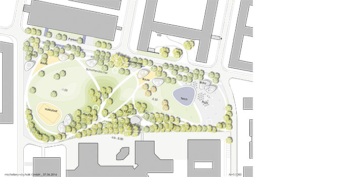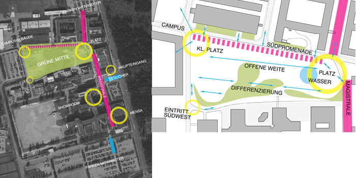 Das Gutachten für das grüne Zentrum eines Arbeits-, Entwicklungs- und Ausbildungsstandorts schlägt ein differenziertes Freiraumsystem mit unterschiedenen Programmen vor. Im Osten bildet ein Platz mit Wasseranlage einen repräsentativen Schwerpunkt. Der Süden wird durch hügelige Topographie, dichter und nischenartiger Vegetation geprägt. Im Norden erstreckt sich eine Promenade mit Sonnendächern. Das Wegenetz wird aus sich überlagernden Loops gebildet, entlang derer sich verschiedene Rauzmsequenzen erleben lassen. |
